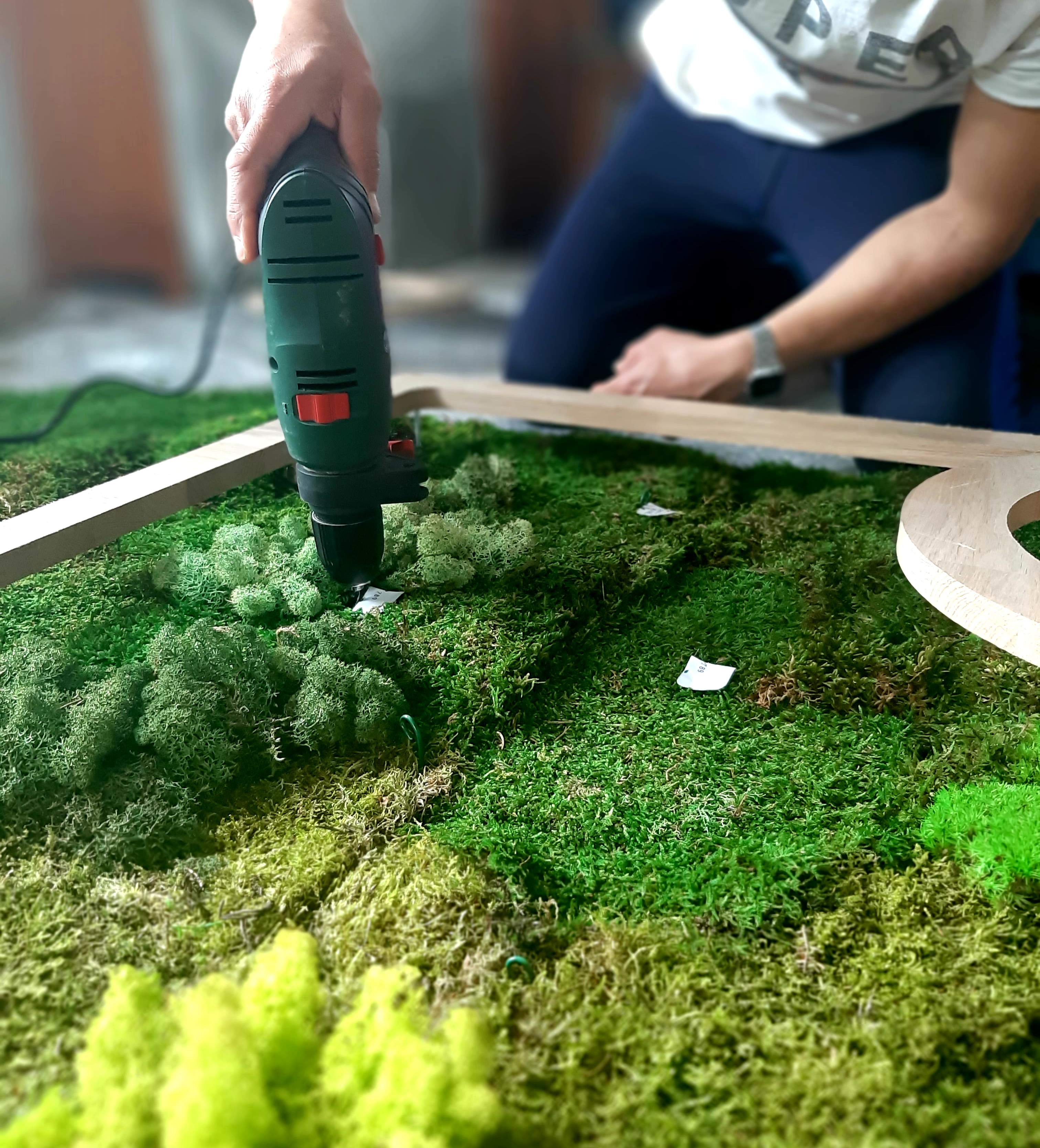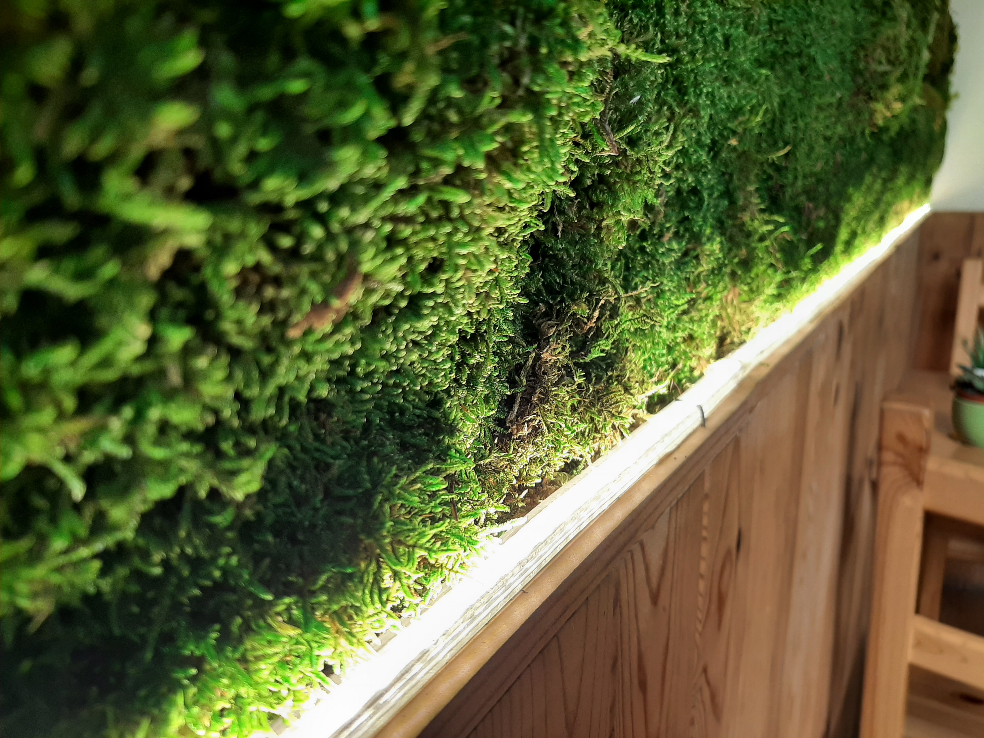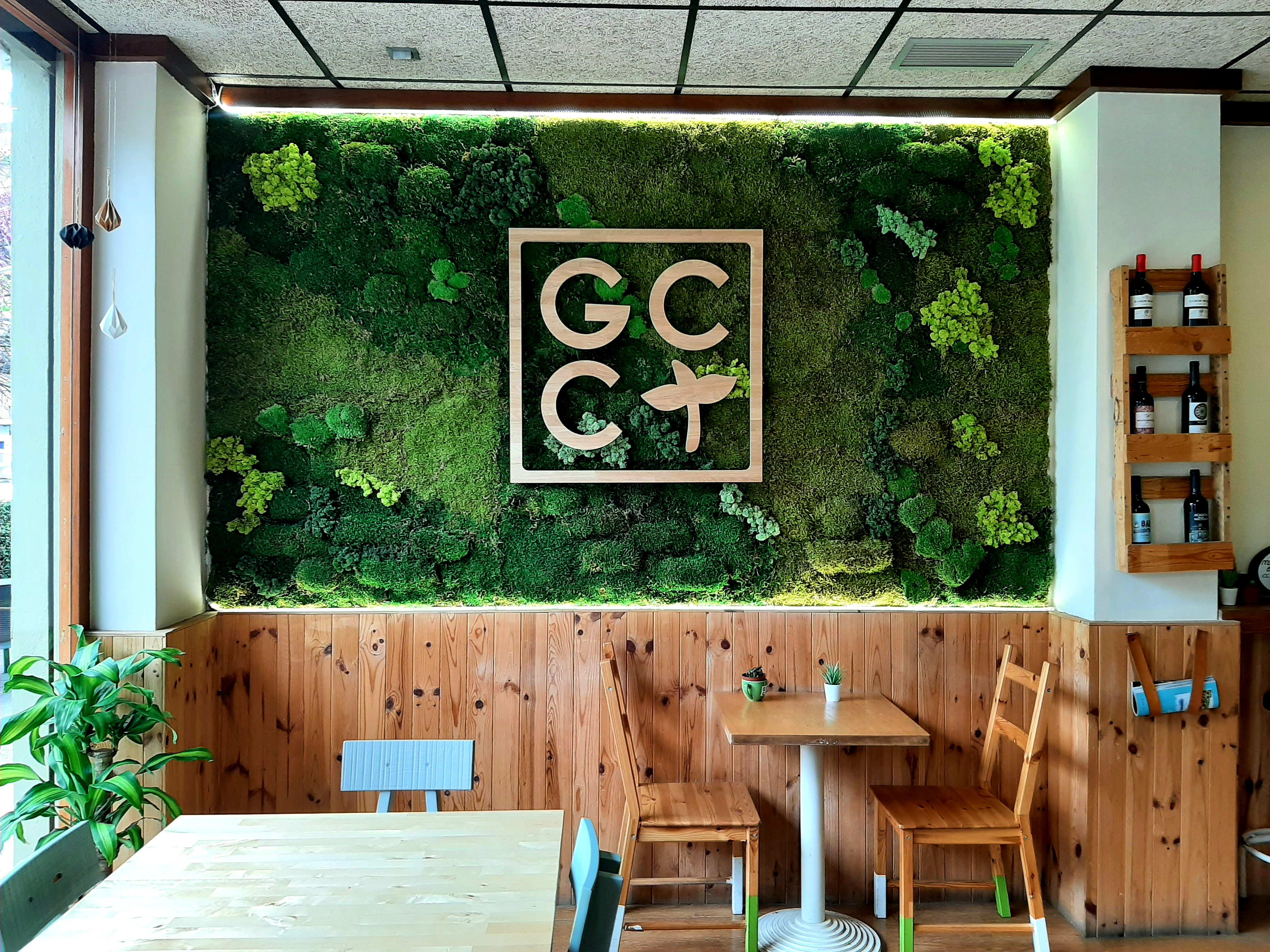 Instalación de jardín vertical de musgo preservado sobre muro en Green Central Coffe - Valencia
